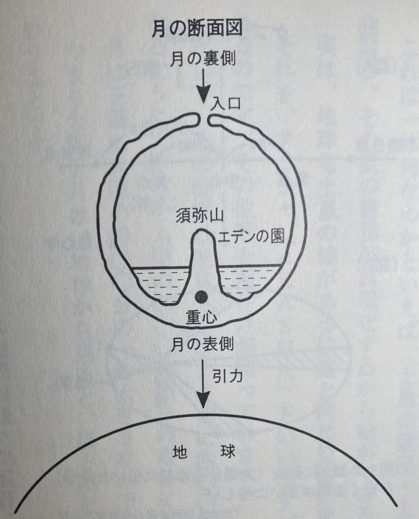 光の存在は、月は次の図のようにオキアガリコボシ状になっており、内側が空洞で、重心が偏ったところにあるため常に同じ方向を向いているのだと伝えます。