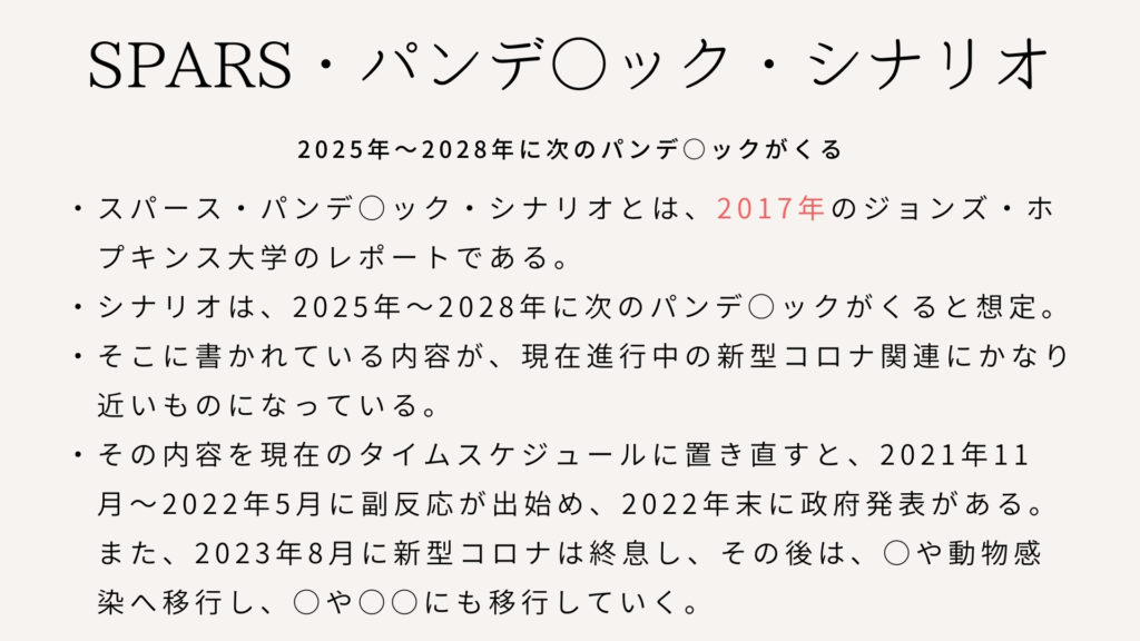 『2023年8月に新型コ●ナは終息し、その後は、〇、動物感染へ移行し、〇や〇〇にも移行していく』←伏字〇部分は、本編で公開しています。